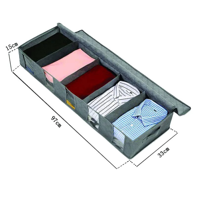 باکس نظم دهنده لباس لیلیوم دارای 5 خانه و از جنس پارچه ضخیم و طلق شفاف ساخته شده و طول آن 97 عرض 33 و ارتفاع 15 سانتیمتر است و مناسب نگهداری البسه, ملحفه و سایر لوازم هست.همچنین دارای درب زیپ دار جهت جلوگیری از نفوذ گرد وغبار می باشد که قابلیت شستشو با دست و ماشین لباسشویی را دارد.