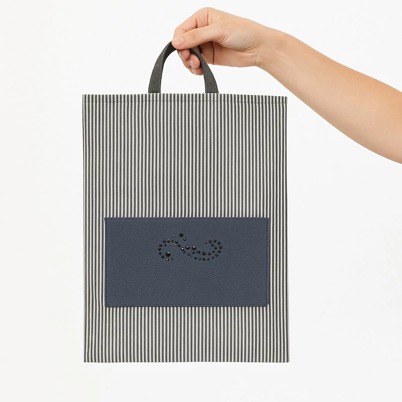 سایر توضیحات: این ساک دستی با طراحی خاص و کاربردی، گزینهای ایدهآل برای افرادی است که به دنبال یک کیف سبک، قابل حمل و چندمنظوره هستند. بدنه ساک از پارچه مقاوم با طرح راهراه تولید شده و جیب جلویی آن از چرم مصنوعی با نگینکاری به زیبایی تزیین شده است. ویژگی منحصربهفرد این محصول، قابلیت جمع شدن آسان و قرار گرفتن در کیف کوچک مخصوص خود است که حمل و نگهداری آن را بسیار راحت میکند.