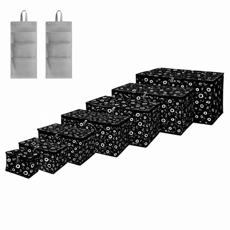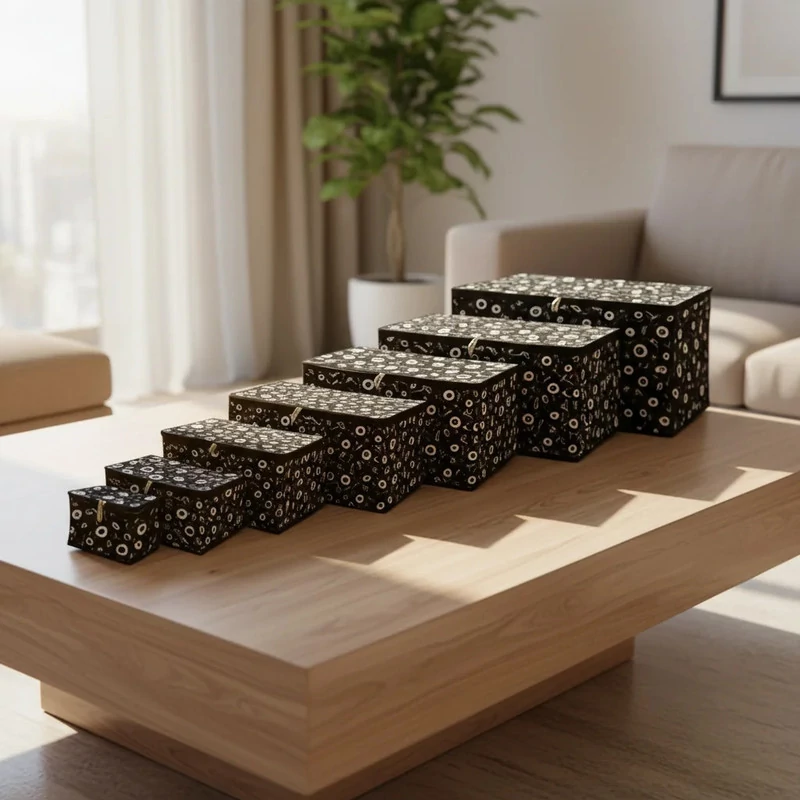 این بسته شامل 7 عدد باکس نظم دهنده (سایزهای 0 و 0.5 و 1 و 2 و 3 و 5 و 7) و همچنین 2 عدد آویز 3 خانه می باشد. بقچه ترکیه ای طرح مینیمال در ابعادهای 118*50*50 و 100*50*50 و 70*42*36 و 65*40*33 و 43*40*25 و 36*31*20 و 30*22*17سانتیمتر می باشد. این نظم دهنده ها از جنس پارچه 3 لایه ترگال ترک و الیاف با سرزیپ فلزی تولید میشود.جنس پارچهی مقاوم و باکیفیت آن، علاوه بر زیبایی، دوام بالایی را هنگام استفاده روزمره تضمین میکند.