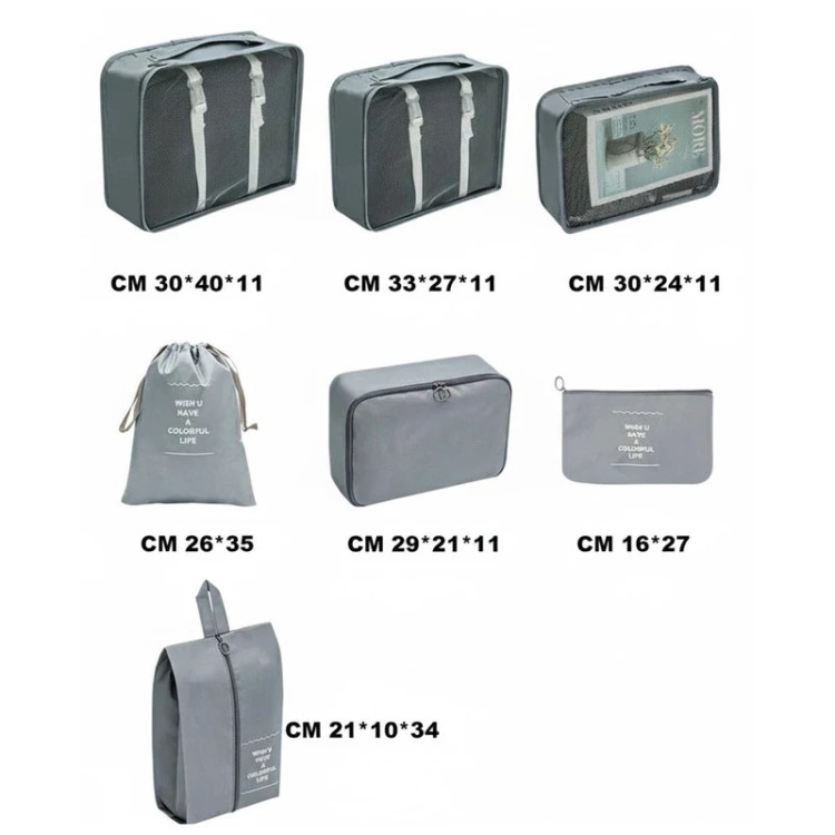 این بسته شامل 7 تکه نظم دهنده چمدان (3 عدد کیسه لباس با درب توری , 3 عدد کیف و 1 عدد کاور کفش) برند مای هوم می باشد. جنس پارچه این محصول شمعی ترک ضد آب و رطوبت می باشد.